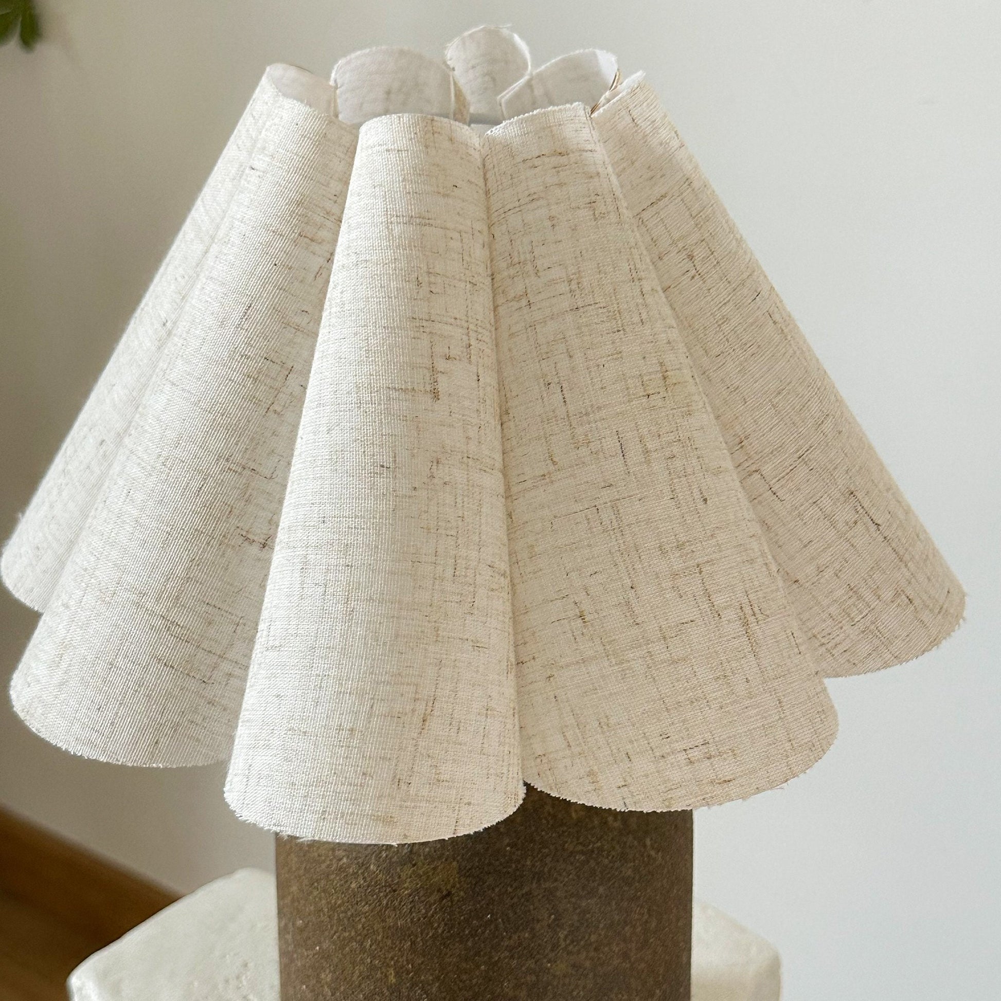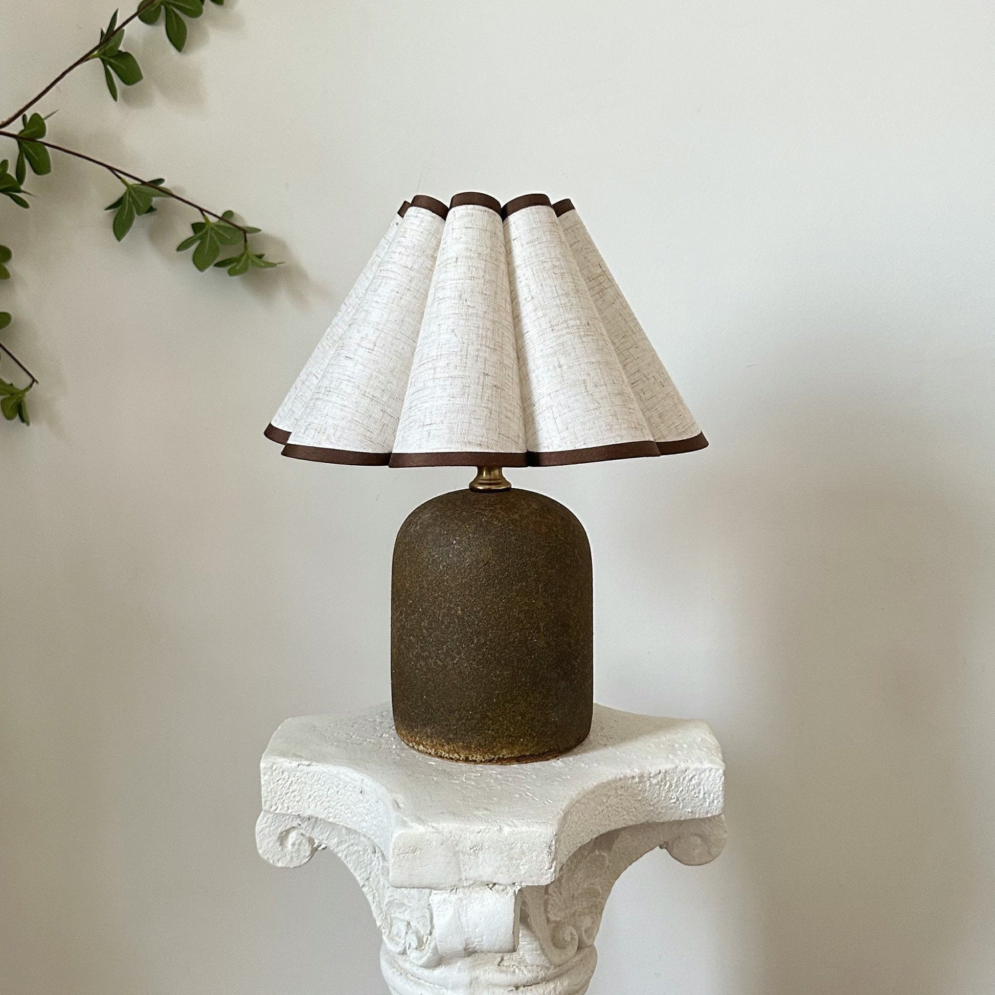 This handmade stoneware lamp features a matte ceramic base and linen fabric pleated petal shade. It works well in bedrooms, living rooms, kitchens — anywhere you want cozy, vintage-inspired light.